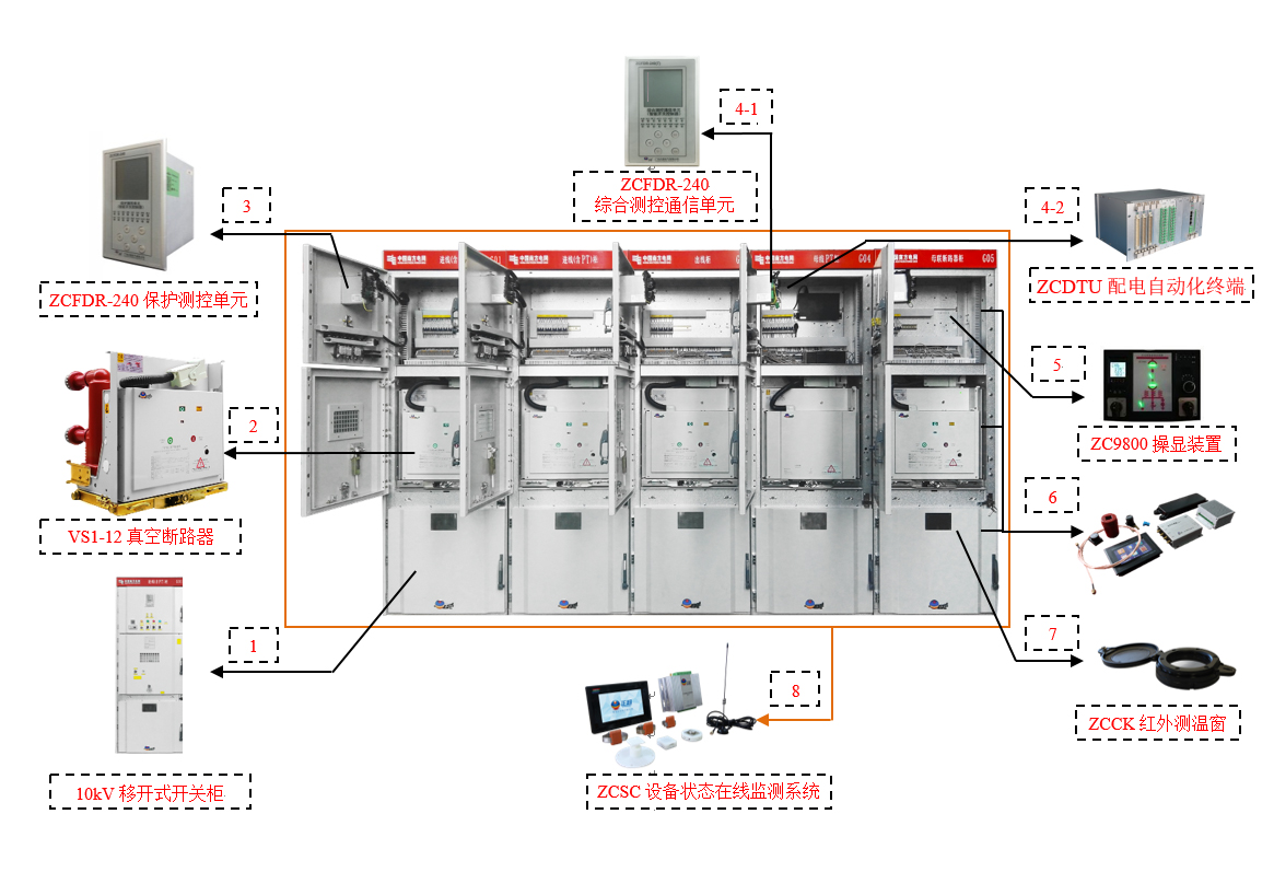 1¡¢ ×ÔÖ÷Æ·ÅÆÒ»´Î×°±¸£¨KYN27ÐÍ¿ª¹Ø¹ñ£©+¶þ´Î×°±¸£¨ZCFDR-240ϵÁÐ×Ô¶¯»¯ÖÕ¶Ë£©ÈںϲúÆ·£»